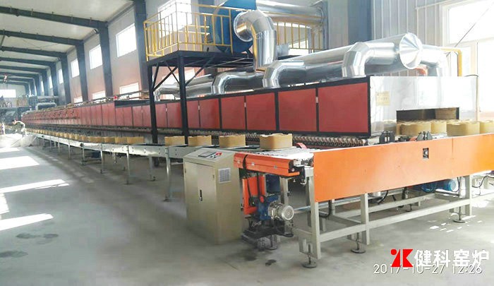 輥道窯的燃燒室在輥?zhàn)拥南路?,用壓縮空氣霧化重油、柴油、煤油等燃料進(jìn)行燃燒。也有用煤氣發(fā)生爐所產(chǎn)煤氣進(jìn)行燃燒的,比較大型的陶瓷廠大都采用雙段冷煤氣站,使用冷靜煤氣進(jìn)行燃燒,產(chǎn)生高溫。燃燒室與輥道之間,有耐火材料隔離,火焰不直接接觸被燒制的產(chǎn)品。相對(duì)來說,煤氣發(fā)生爐配套輥道窯燃燒比重油、柴油等成本低,比直接燃煤效率高環(huán)保達(dá)標(biāo)。使用重油為燃料時(shí),為防止煙氣污染制品,要采取隔焰或半隔焰形式。電熱時(shí),為保護(hù)發(fā)熱體或使溫度更均勻,也需將發(fā)熱體和制品隔開。